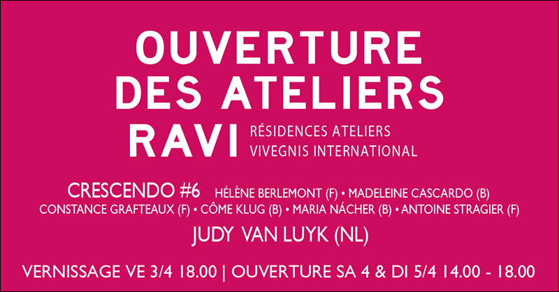 À Liège, le RAVI a bien entendu souhaité être un des partenaires des Beaux-arts pour ce projet inédit en région liégeoise. Le RAVI propose ainsi une exposition des six jeunes diplômés de Crescendo #5 (et non pas #6 comme noté sur leur flyers), puisque nous en sommes à la 5e édition. Les diplômés sont Justine de Raikem, Alexandre Humblet, Hsiao-Mei Hsu, Théo Pollaert, Florian Schaff, Shuya Zhu. Ils présenteront leurs travaux réalisés au sein du RAVI.